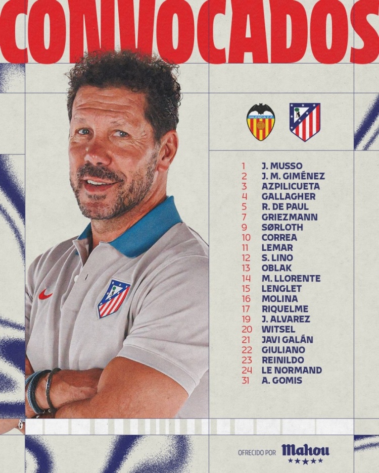 馬競戰(zhàn)瓦倫大名單:格列茲曼領(lǐng)銜,巴里奧斯停賽,科克傷缺