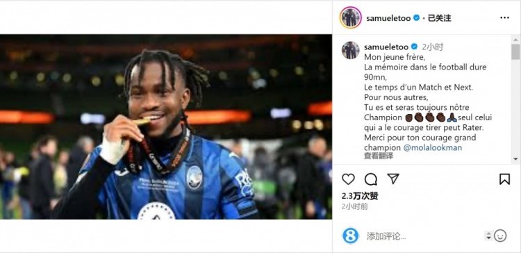 非洲足壇名宿、喀麥隆足協(xié)主席埃托奧社媒發(fā)文,鼓勵盧克曼(尼日利亞前鋒),他寫道:“我的小老弟,在足球世界里記憶只存留90分鐘,這是一場比賽的時間,然后就是下一場?!?/p>