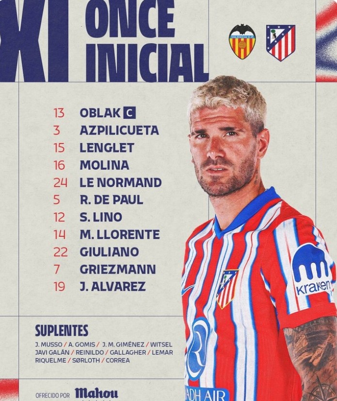 13-奧布拉克、3-阿斯皮利奎塔、15-朗格萊、16-莫利納、24-勒諾爾芒、5-德保羅、12-利諾、14-馬科斯-略倫特、22-朱利亞諾-西蒙尼、7-格列茲曼、19-阿爾瓦雷斯