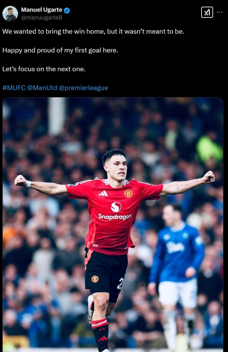 2月23日訊 本輪英超比賽中,曼聯(lián)2-2戰(zhàn)平埃弗頓,烏加特打進自己的紅魔生涯首球。賽后,他更新動態(tài),表示很遺憾沒能獲勝。
