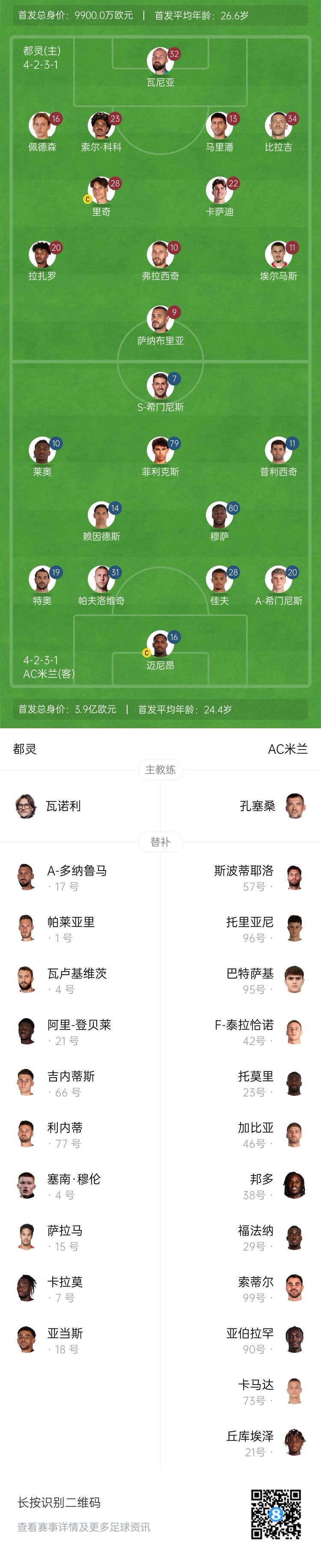 都靈首發(fā):32-瓦尼亞、16-佩德森、23-索爾-科科、13-馬里潘、34-比拉吉、28-里奇、22-卡薩迪、20-拉扎羅、10-弗拉西奇、11-埃爾馬斯、9-薩納布里亞
