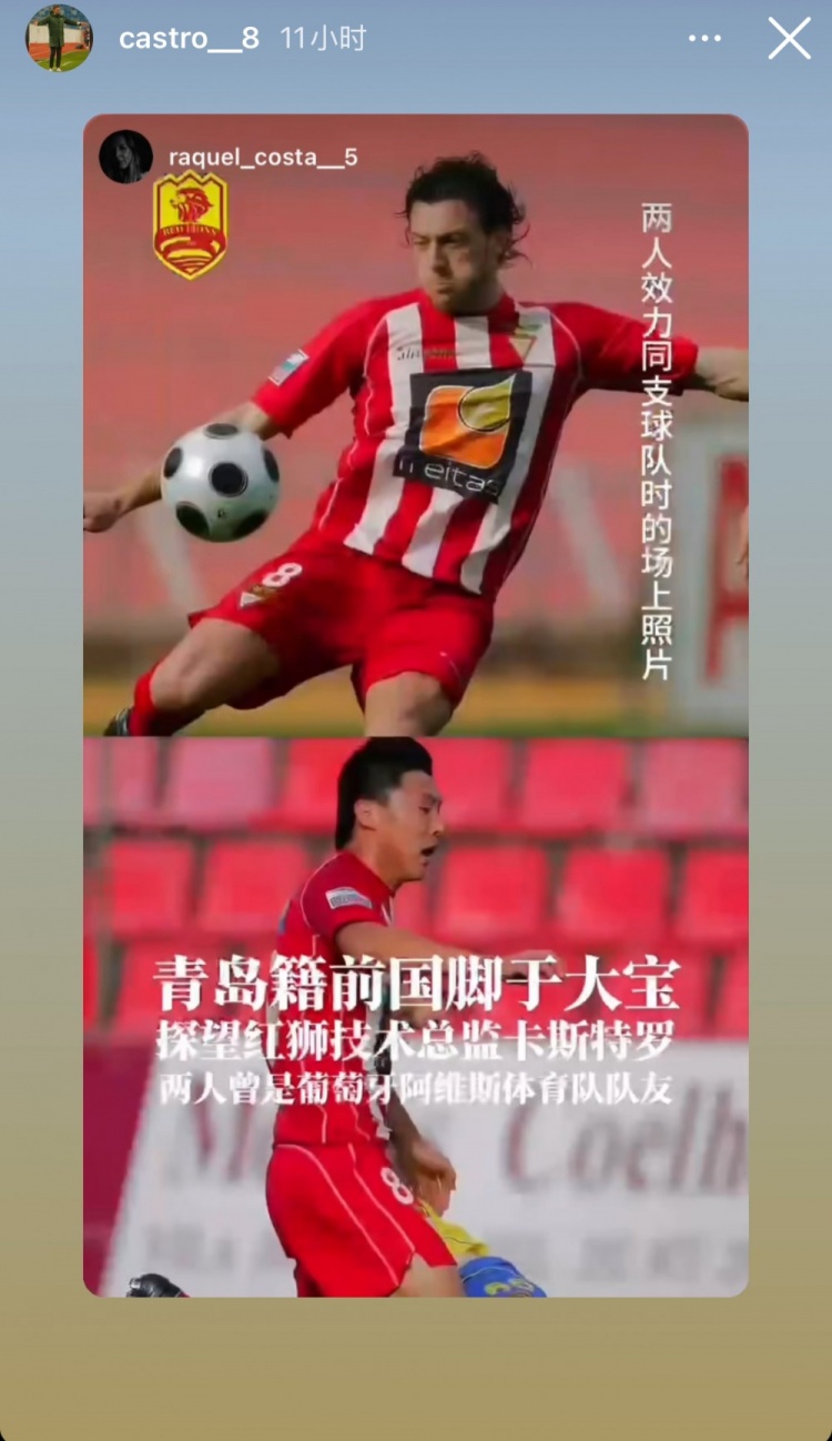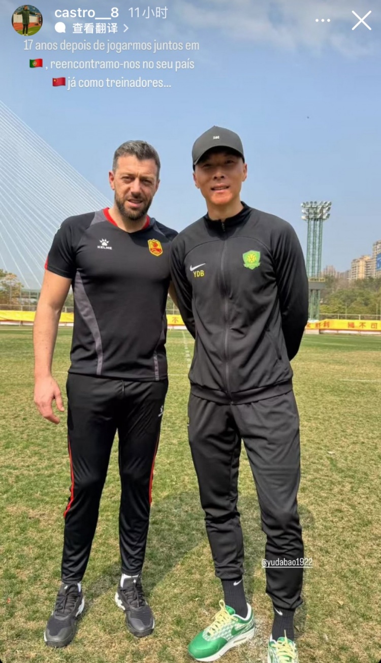 卡斯特羅在社媒曬出他倆的合影并配文介紹寫道:“在葡萄牙時我們是隊(duì)友,17年后我們以教練身份在中國相聚?!?/p>