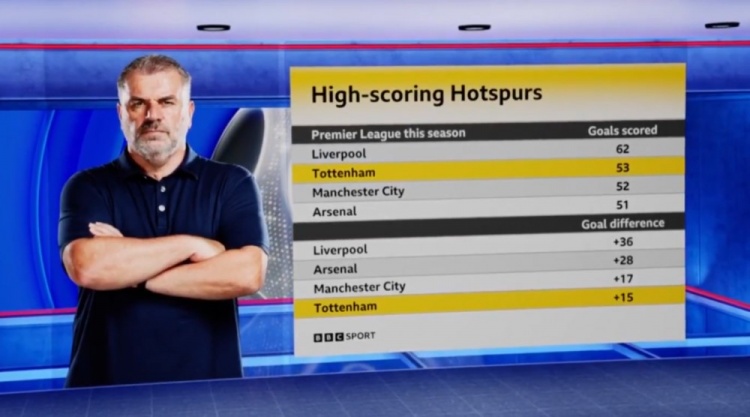 根據(jù)BBC統(tǒng)計,熱刺本賽季英超打進53球排名第二,目前僅次于打進62球的利物浦。在凈勝球方面,熱刺+15排名英超第四位,僅次于利物浦、阿森納、曼城。