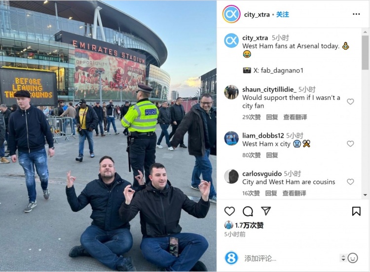 2月23日訊 英超第26輪比賽,西漢姆客場1-0擊敗阿森納。此役賽后西漢姆球迷在場外做出哈蘭德標志性的打坐慶祝動作,哈蘭德在社交媒體上為相關照片點贊。 標簽: 足球 英超 阿森納 曼城 西漢姆聯(lián) 哈蘭德