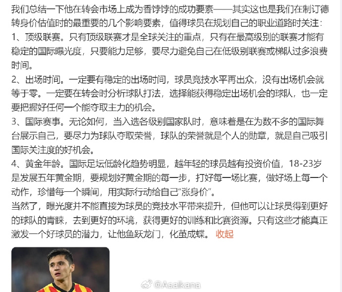 我之前寫了篇介紹胡桑諾夫的長微博,提出了一個球員曝光度對于球員職業(yè)生涯和能力影響的問題。其實當(dāng)時有很大程度上是寫給準(zhǔn)備迎接各級大賽的各年齡段國足,尤其是當(dāng)時正在備戰(zhàn)亞青賽的國青隊員和家長們看的。很巧,我看到賽后有很多人也都在為國青球員們失去了在世界球探面前展現(xiàn)自己的機(jī)會而惋惜不已。一個有才華的球員,只有在足夠的曝光度下,才能從被忽視的角落走向舞臺的中央,迎接屬于自己的機(jī)遇與挑戰(zhàn)。只有當(dāng)他站在更廣闊的平臺上,才能借助更強(qiáng)大的資源,迅速提升自我,釋放潛力,達(dá)到職業(yè)巔峰。但是真的很可惜,可惜到我已經(jīng)不想去回想下午那場球了。