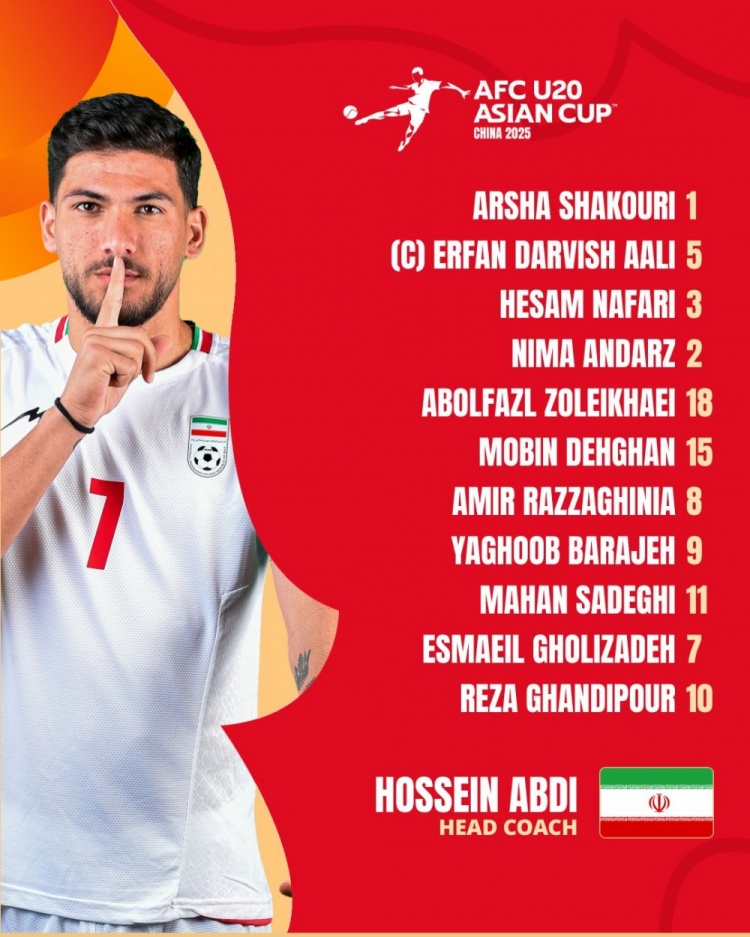 伊朗U20首發(fā):1-阿爾沙-沙庫里、18-阿博法茲-佐雷哈伊、3-希薩姆-納法里、5-埃爾凡-達(dá)爾維沙利、4-尼瑪-安達(dá)日、11-馬漢-薩德吉、15-莫賓-德甘、8-阿米爾穆罕默德-拉扎吉尼亞、9-雅古-布巴拉吉、7-埃斯梅爾-格霍利扎德、10-雷薩-甘迪普爾