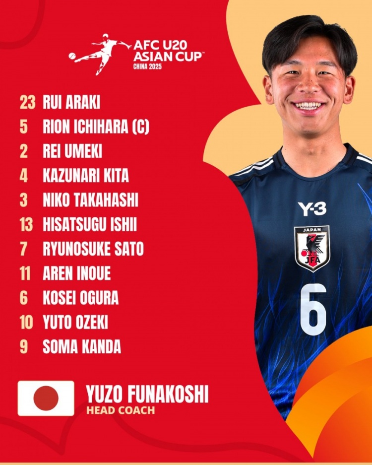 日本U20首發(fā):23-荒木琉偉、3-高橋仁胡、5-市原吏音、4-喜多壱也、2-梅木憐、13-石井久繼、7-佐藤龍之介、10-大關(guān)友翔、6-小倉幸成、11-井上愛簾、9-神田奏真