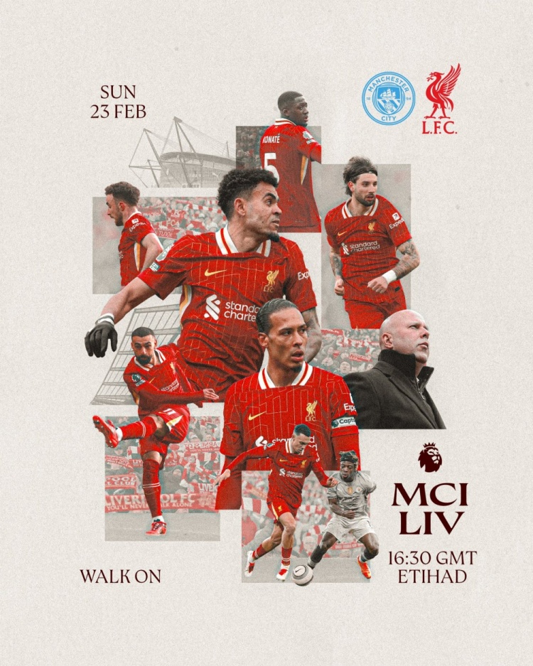 利物浦發(fā)布客戰(zhàn)曼城海報(bào):斯洛特、范迪克、薩拉赫、迪亞斯出鏡