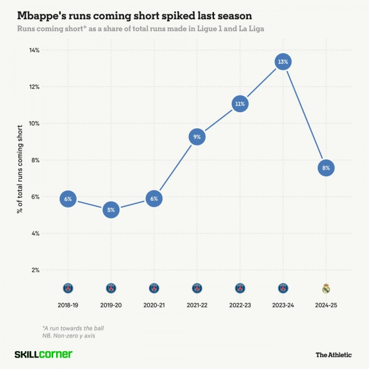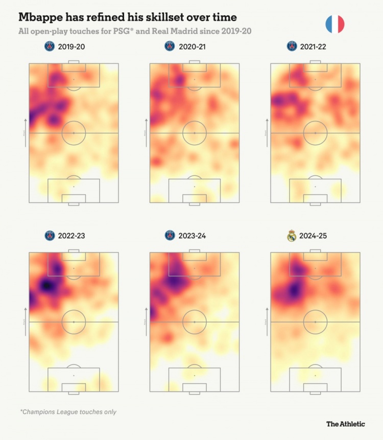 姆巴佩向更傳統(tǒng)的中鋒演變,則是在他轉會到皇馬之后,進入了快車道。