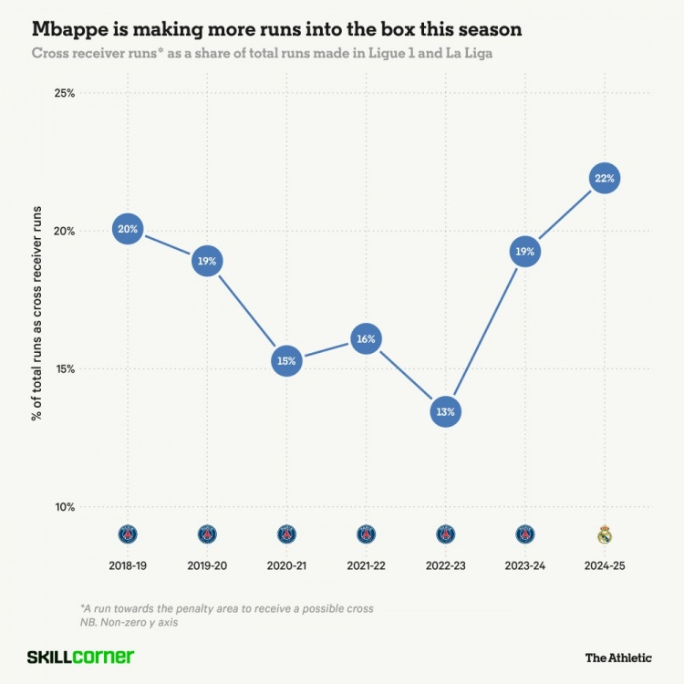 由于維尼修斯是皇馬左路的首選,所以姆巴佩也逐漸學會了在左路內線尋找機會,而他身后跑位、在禁區(qū)內的跑動次數(shù)也在提升。