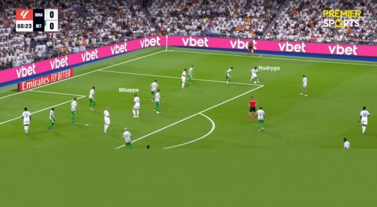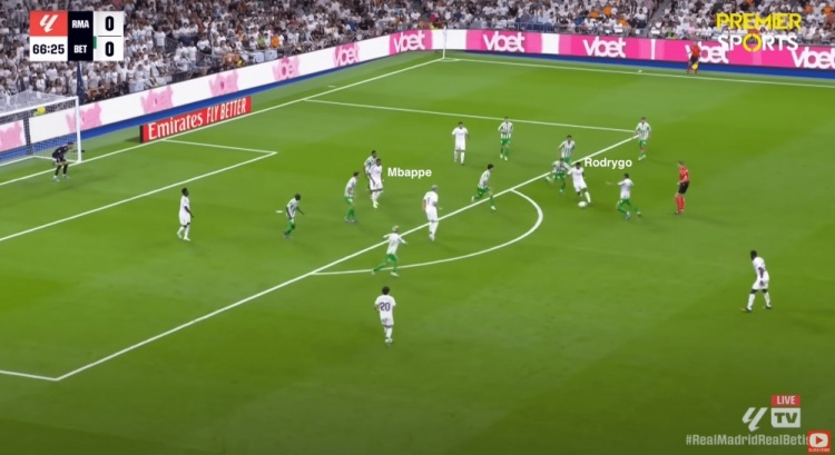 當羅德里戈從右路帶球內切之時,姆巴佩背對著球門,以便更好地創(chuàng)造進攻空間……