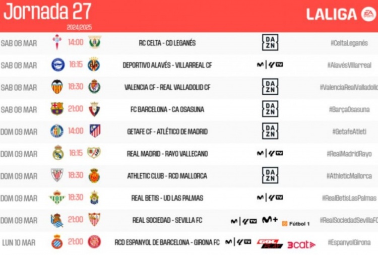 2月23日訊 近日,西甲官網(wǎng)公布了聯(lián)賽第27輪的比賽時(shí)間,巴薩、皇馬和馬競(jìng)均在本輪比賽中對(duì)陣弱旅。