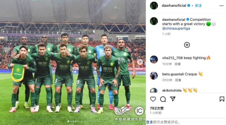 本場(chǎng)比賽國安新援達(dá)萬首發(fā)出戰(zhàn),上演國安首秀,賽后他在社媒曬出比賽照慶祝勝利,并配文寫道:“以一場(chǎng)偉大的勝利開啟賽季征程。”