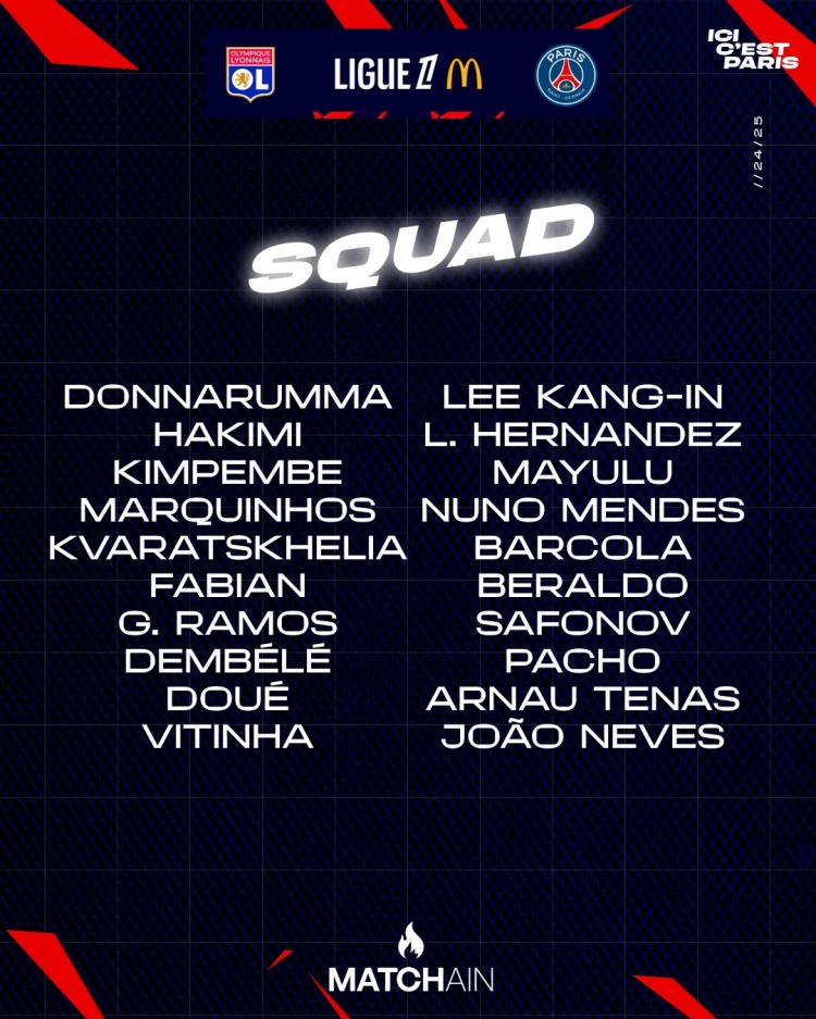 2月23日訊 北京時(shí)間明天凌晨3點(diǎn)45分,巴黎將在法甲第23輪比賽中客場(chǎng)對(duì)陣?yán)锇骸0屠韫剂舜艘鄣那騿T名單,登貝萊、克瓦拉茨赫利亞、阿什拉夫、若昂-內(nèi)維斯在列。