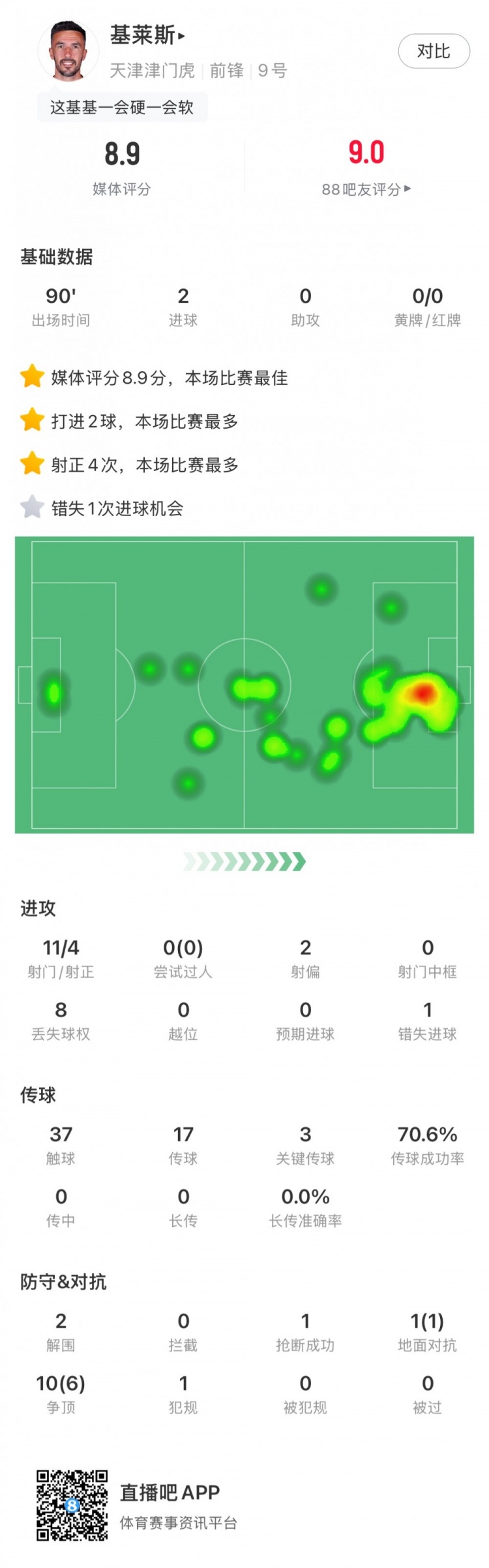 基萊斯全場(chǎng)數(shù)據(jù):11次射門(mén)4次射正 最后時(shí)刻連進(jìn)2球拯救津門(mén)虎