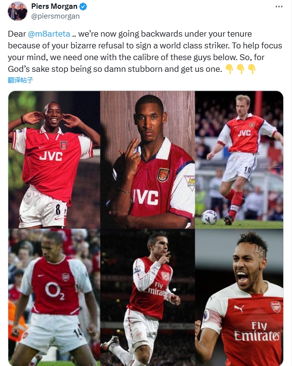 摩根曬亨利、博格坎普等人照片寫到:“親愛的阿爾特塔,我們在你的執(zhí)教下正在倒退,因為你莫名地拒絕簽下一位世界級前鋒。為了幫助你專注,我們需要一個有下面這些人能力的球員。因此,看在上帝的份上,別這么固執(zhí),給我們找一個吧?!?/p>