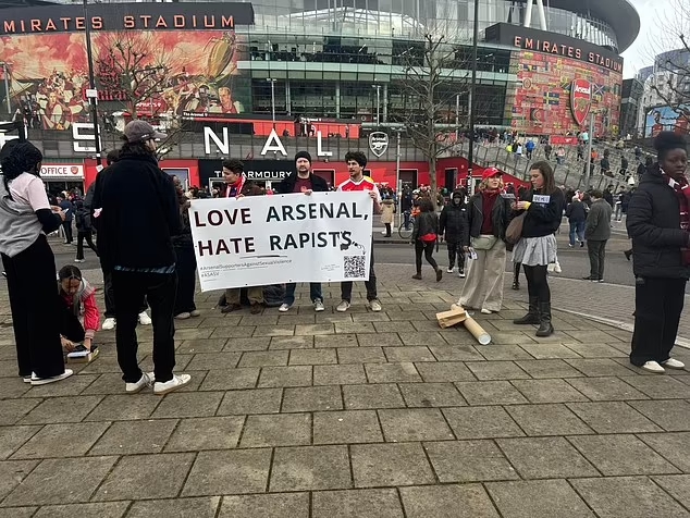 2月25日訊 《每日郵報(bào)》報(bào)道,在阿森納和西漢姆的比賽前,有阿森納球迷在球場(chǎng)外抗議強(qiáng)奸犯和性暴力。