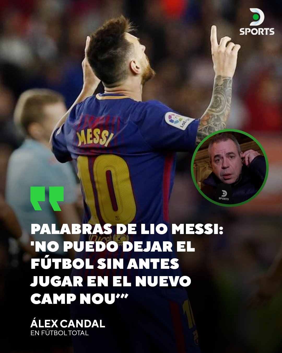 Alex candal透露,梅西將在不久的將來回到巴塞羅那。他還表示:“梅西的話是‘在新諾坎普球場踢球之前,我不能離開足球?!?/p>