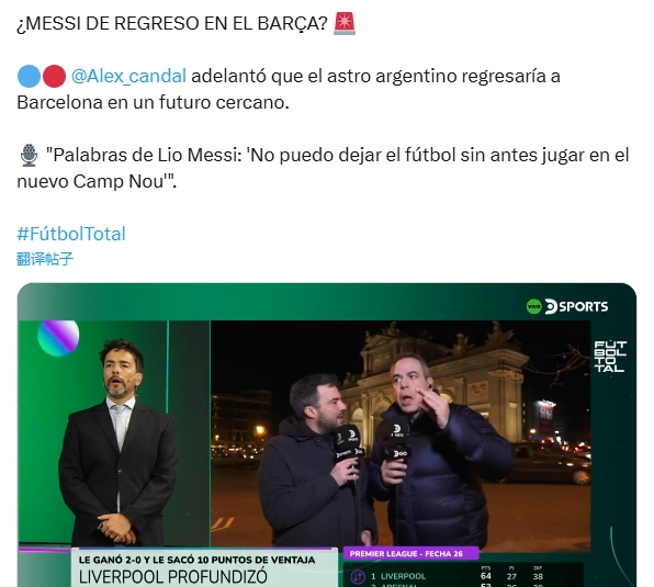 02月25日訊 記者Alex candal在節(jié)目中透露,梅西即將重返巴塞羅那,目前效力于邁阿密國際的阿根廷天王對新諾坎普球場非常感興趣。