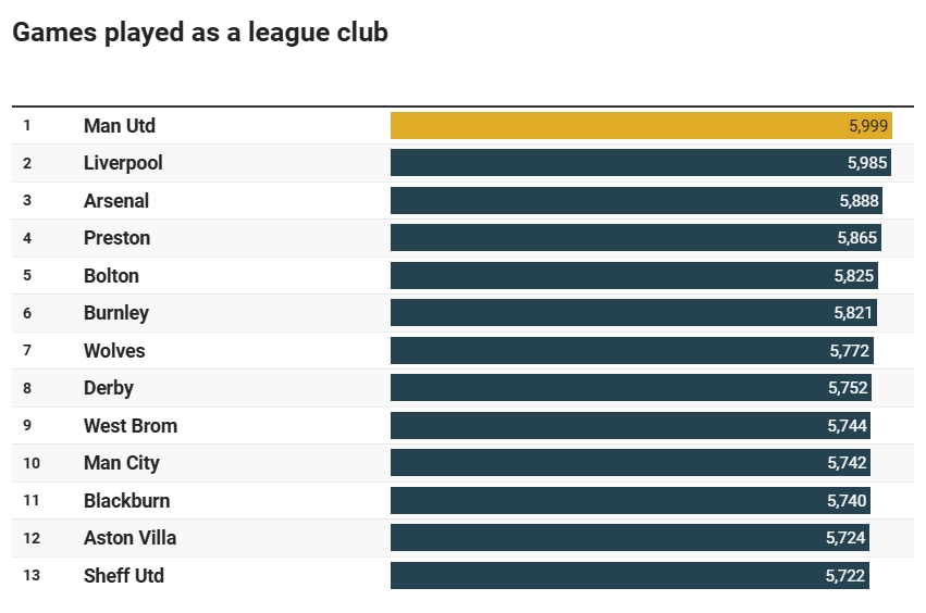 目前的英格蘭俱樂部出戰(zhàn)場(chǎng)次排行榜中,曼聯(lián)以5999次居首,高于利物浦和阿森納。