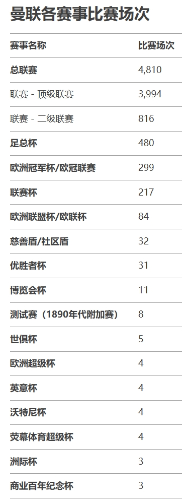 曼聯(lián)這5999場(chǎng)比賽中,超過(guò)4800場(chǎng)為聯(lián)賽,480場(chǎng)為足總杯,299場(chǎng)為歐冠及其前身,此外還包括各類杯賽。