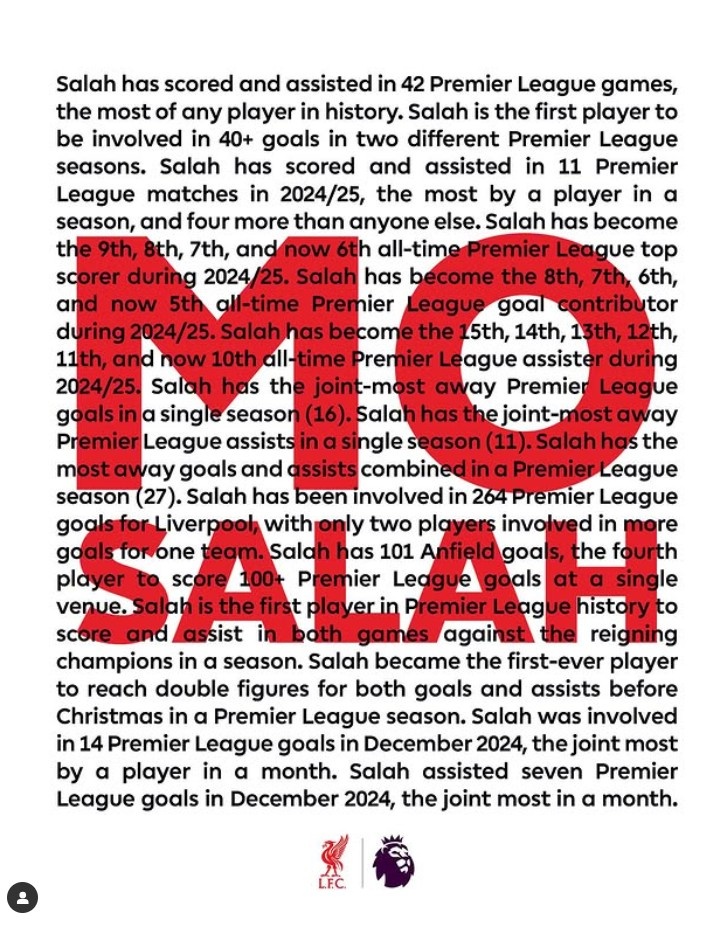 11,薩拉赫在安菲爾德取得101粒英超進球,是英超歷史上在單一體育場第四位進球破百的球員。