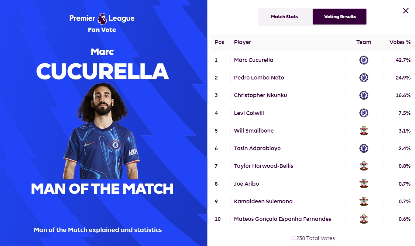 2月26日訊 本輪英超,切爾西主場(chǎng)4-0戰(zhàn)勝南安普頓。此役庫(kù)庫(kù)雷利亞發(fā)揮出色,以42.7%的得票率當(dāng)選全場(chǎng)最佳球員。
