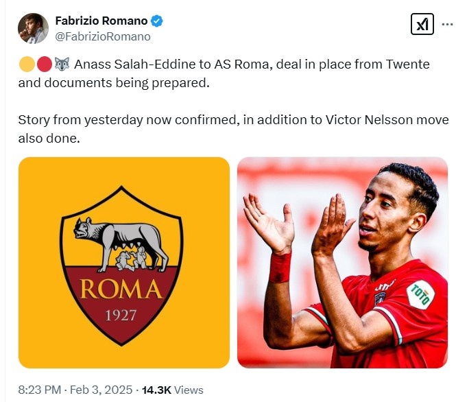 2月3日訊 羅馬諾報道,23歲左后衛(wèi)薩拉赫-埃丁將加盟羅馬,交易文件正在準(zhǔn)備中。