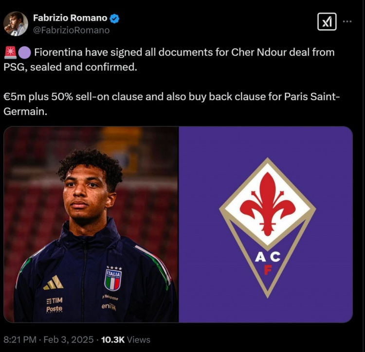 2月3日訊 名記羅馬諾消息,佛羅倫薩已經(jīng)簽署了引進(jìn)恩杜爾所需的一切文件,巴黎將收到500萬(wàn)歐元的轉(zhuǎn)會(huì)費(fèi),還有恩杜爾50%的二次轉(zhuǎn)會(huì)費(fèi)的分成條款。同時(shí),巴黎也擁有優(yōu)先回購(gòu)恩杜爾的條款。