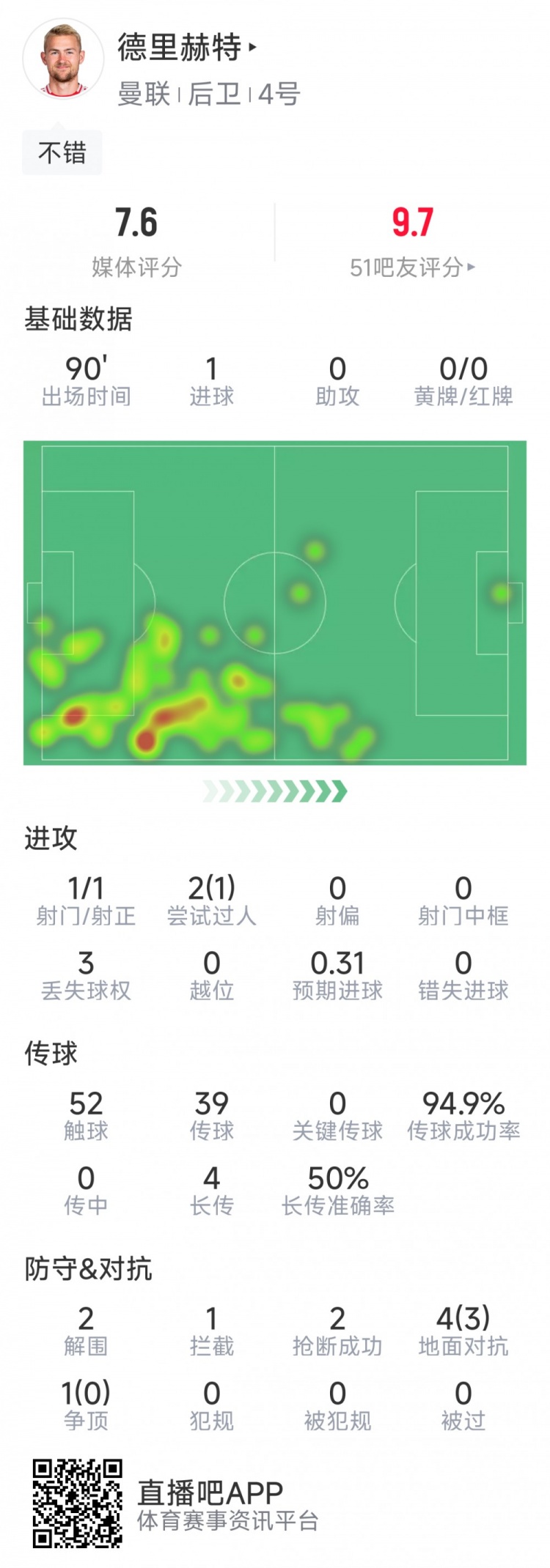 2月27日訊 在本輪英超,曼聯(lián)3-2擊敗伊普斯維奇,德里赫特破門(mén),以下為他在本場(chǎng)數(shù)據(jù):