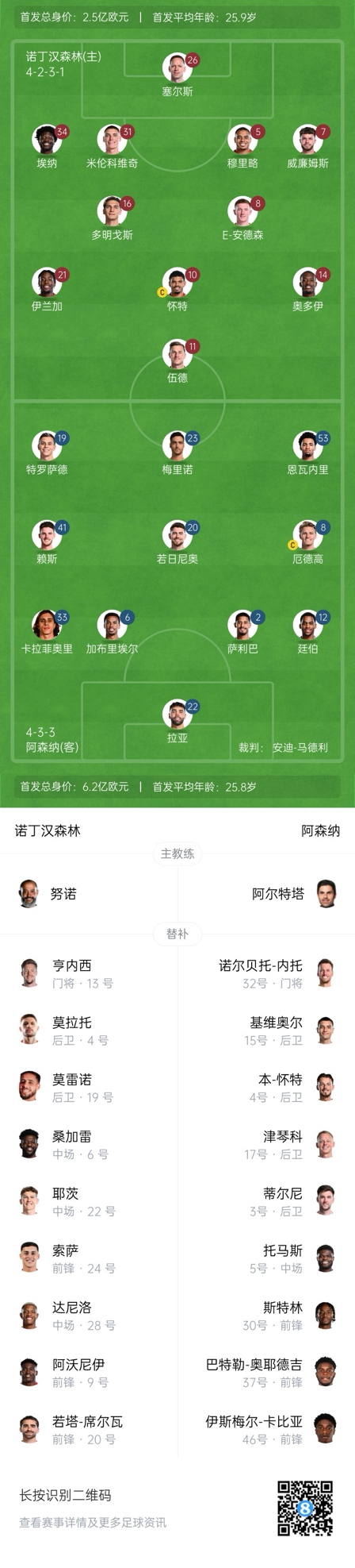 諾丁漢森林首發(fā):26-塞爾斯、5-穆里略、7-內(nèi)科-威廉姆斯、16-尼古拉斯-多明戈斯、31-米倫科維奇、34-埃納、8-埃利奧特-安德森、10-吉布斯-懷特、11-克里斯-伍德、14-奧多伊、21-伊蘭加