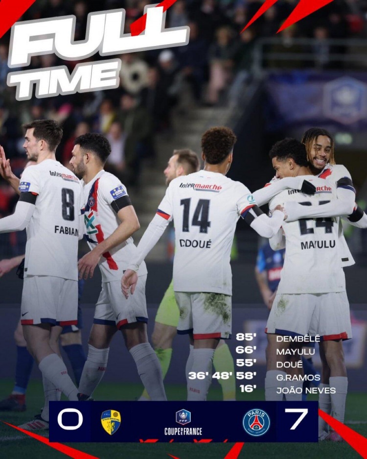 法國(guó)杯-巴黎7-0大勝布里歐齊 貢薩洛-拉莫斯3射1傳杜埃1射2傳