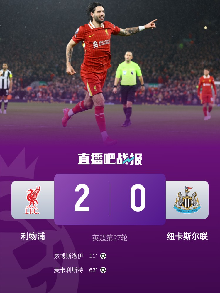 索博斯洛伊、麥卡利斯特破門(mén),利物浦主場(chǎng)2-0戰(zhàn)勝紐卡,多賽一場(chǎng)領(lǐng)先阿森納13分。