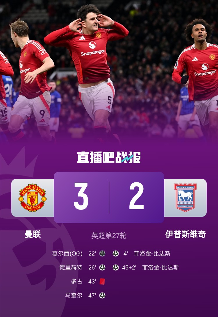 多古送禮+染紅,馬奎爾頭球破門(mén),曼聯(lián)3-2逆轉(zhuǎn)伊普斯維奇。