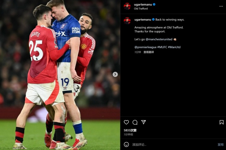 烏加特曬出自己和德拉普頂牛的照片,并寫(xiě)道:重回勝利軌道,老特拉福德球場(chǎng)的氛圍非常棒,感謝大家的支持。加油曼聯(lián)????。