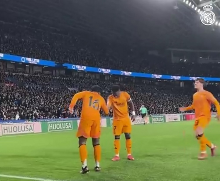 國王杯戰(zhàn)勝皇家社會,恩德里克進(jìn)球后與維尼修斯握手慶祝