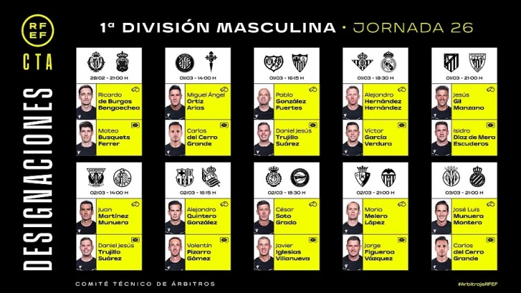 西甲第26輪具體裁判安排如下: