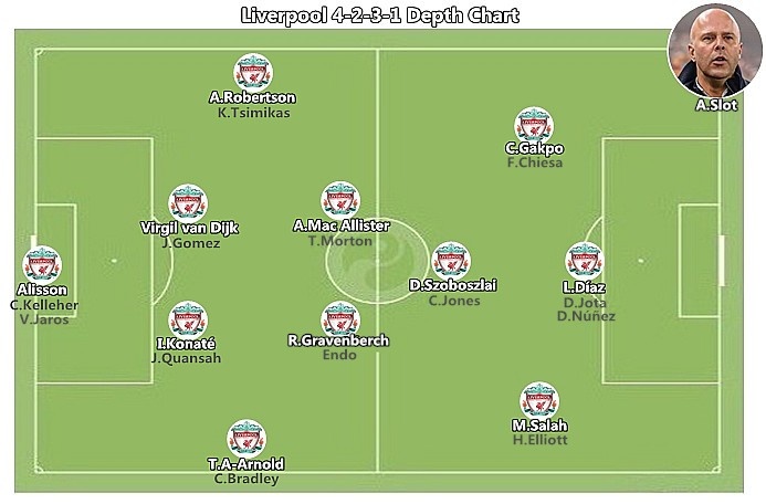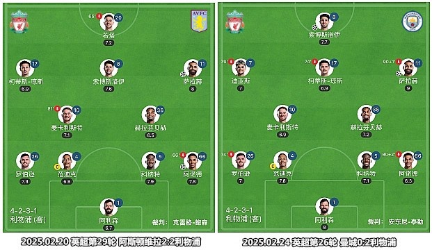 四天內(nèi)兩戰(zhàn)強(qiáng)敵,利物浦的首發(fā)陣容只有1處變化,斯洛特使用了兩種截然不同的陣型和打法。