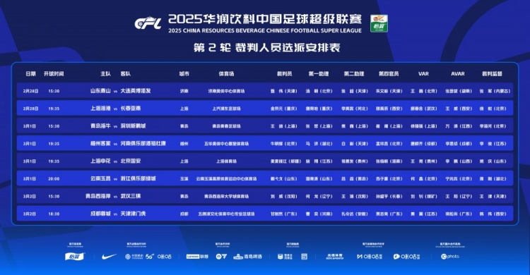 2月28日訊 中超官方公布中超第2輪裁判安排,麥麥提江將吹罰申花vs國安的焦點大戰(zhàn)。