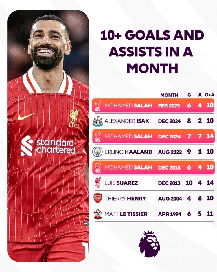 薩拉赫:2025年2月、6球4助制造10球