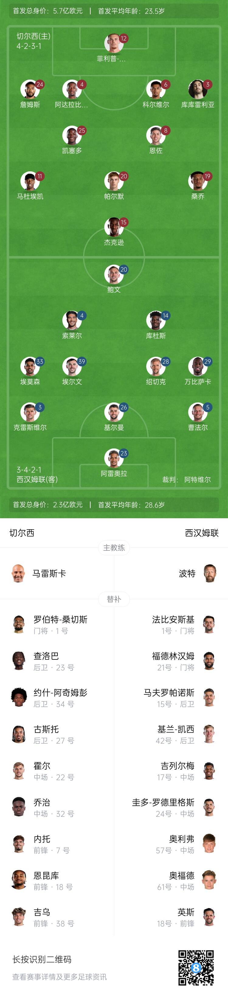 切爾西首發(fā):12-約根森、24-里斯-詹姆斯、4-阿達(dá)拉比奧尤、6-科爾維爾、3-庫(kù)庫(kù)雷利亞、25-凱塞多、8-恩佐、11-馬杜埃凱、20-帕爾默、19-桑喬、15-杰克遜