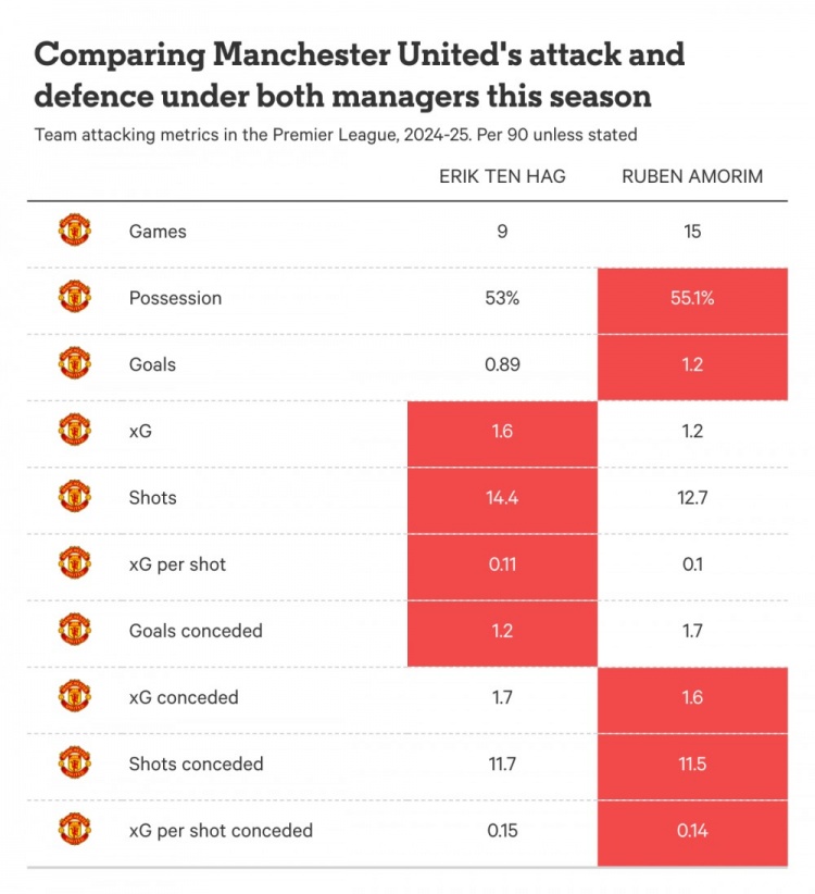 阿莫林加盟至今,曼聯在比賽中的關鍵指標是否發(fā)生了變化?