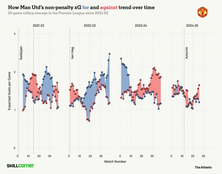 不過,對比兩位主帥治下曼聯的進攻基礎數據,又會發(fā)現,曼聯的進攻實際上是有所倒退的。較低的預期進球和較少的射門數表明,阿莫林仍有很多工作要做,只有曼聯真正貫徹了阿莫林的進攻思想,才有可能形成“肌肉記憶”。