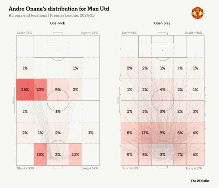 問題似乎在進攻組織的早期階段就已經出現,從奧納納開始就是如此。曼聯似乎還沒有找到他最適合的出球方式——盡管現在有點兒趨勢了。本賽季,無論是在滕哈赫,還是在阿莫林麾下,奧納納經常會采用長傳球的方式出球,如下圖所示。