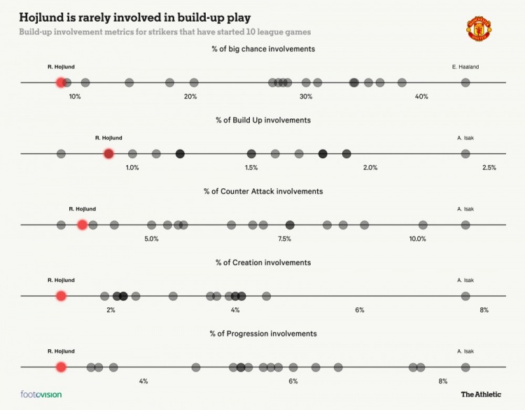 從他在英超比賽中的接球情況來看,B費傳球給他的次數是最多的——但很能說明問題的事,本賽季利桑德羅-馬丁內斯、馬茲拉維和奧納納傳球給霍伊倫的次數超過了阿瑪德、加納喬和梅努。