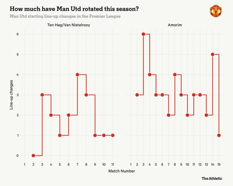 在對陣埃弗頓的比賽中,阿莫林的首發(fā)名單中只有一個位置進行了調整,這也是他15場聯賽中調整最小的一次。