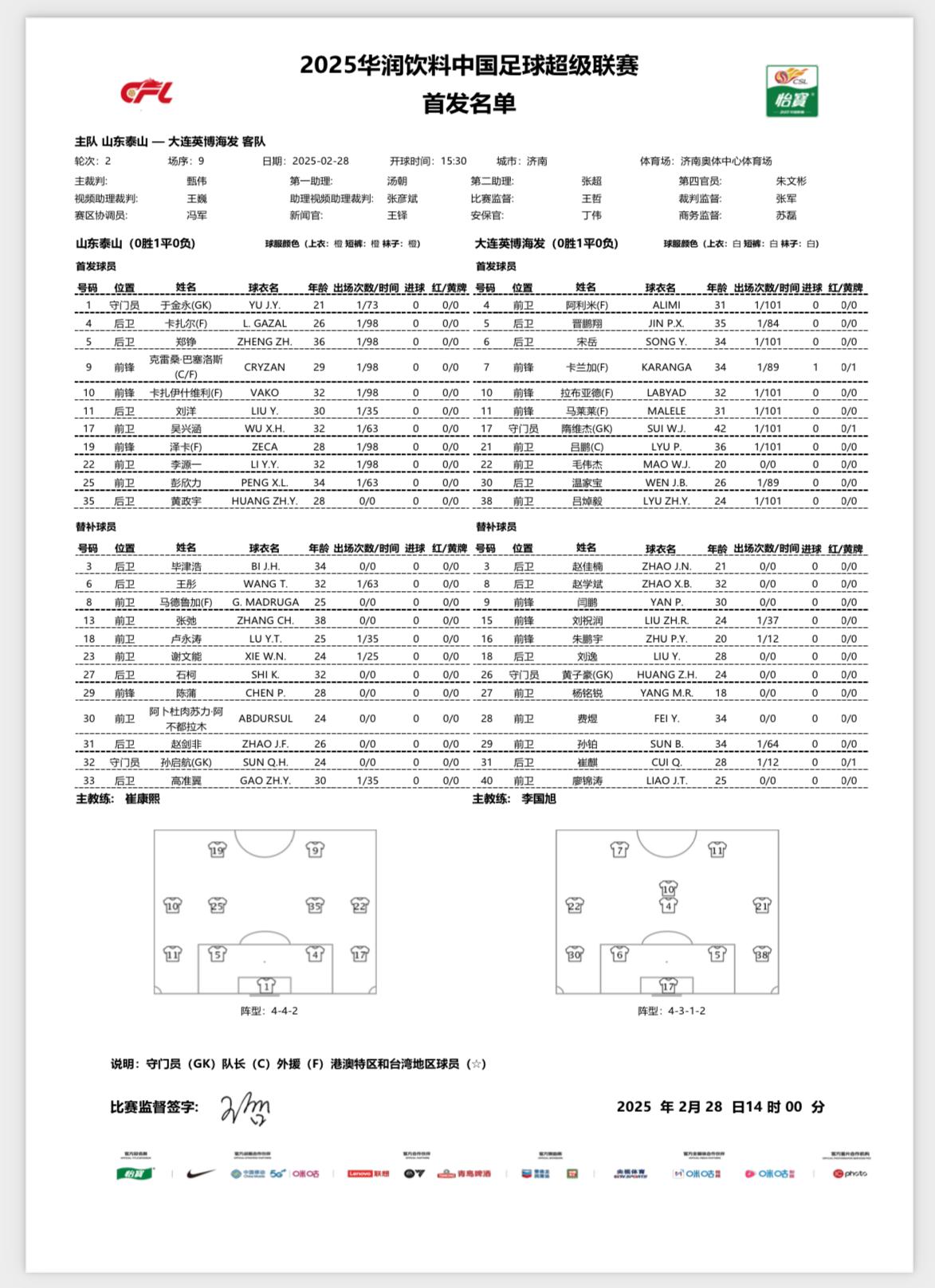 泰山聯(lián)賽第二輪首發(fā)出爐,謝文能替補。
