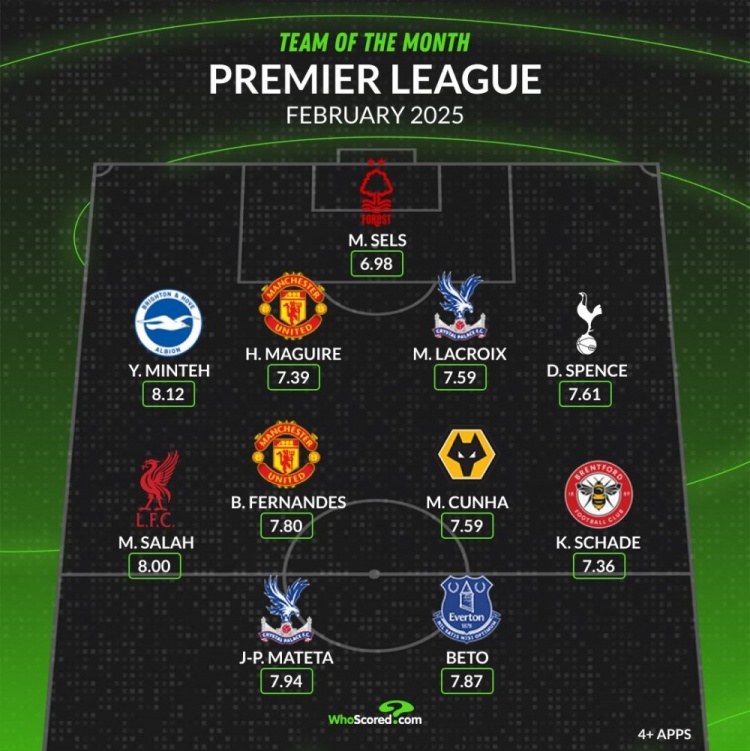 3月1日訊 英超2月比賽已經(jīng)完賽,whoscored也統(tǒng)計(jì)了本月評分最佳陣容,水晶宮和曼聯(lián)各2人入選。