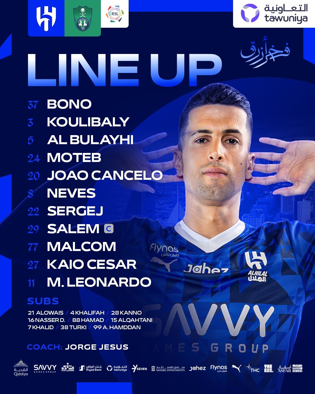 利雅得新月替補:21-奧瓦斯、4-哈利法、28-卡努、16-納賽爾-多薩里、88-哈馬德、15-阿爾卡塔尼、7-加納姆、38-圖爾基、99-哈姆丹
