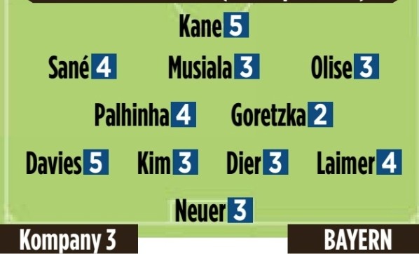 首發(fā):凱恩5分、薩內(nèi)4分、穆西亞拉3分、奧利塞3分、帕利尼亞4分、格雷茨卡2分、戴維斯5分、金玟哉3分、戴爾3分、萊默爾4分、諾伊爾3分